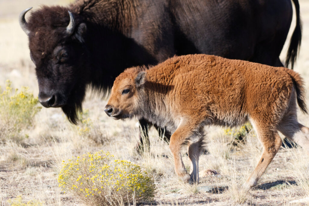 Ever since I learned that when buffalo or bison babies are first born in the springtime that they are a beautiful orange color, I have wanted to get a good picture of one. I have spent many frustrating hours only to get far away shots that were not great. However, this Fall, I was ecstatic to see a group of buffalo crossing the road in front of me and amazingly, there were three new, orange babies, and I got this shot from the comfort of my truck.