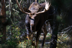 This beautiful Fall day during the rutting season for moose could have been my last. I was looking for bull moose to photograph, fully aware that they can get cantankerous this time of year. I stopped by a stream that went from the open spaces where moose love to hang out and eat, into the thick forest. Soon I came upon this bull moose.