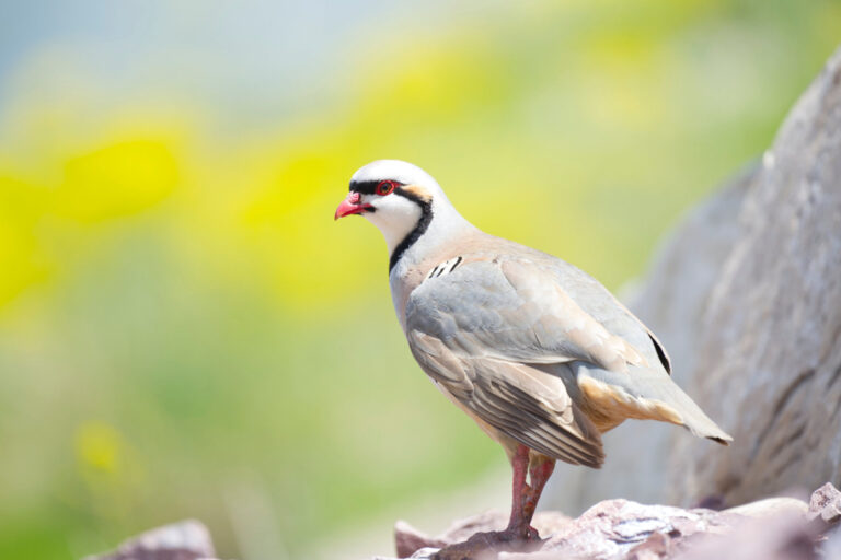 I was driving through a high end neighborhood in North Salt Lake, Utah. I was surprised to see 2 birds crossing the road in front of me. They looked like quail, but they were noticeably bigger and more colorful. I followed them around with my camera out my window and got this shot with yellow flowers in the background and when I looked it up I found out that they were chukar partridges.