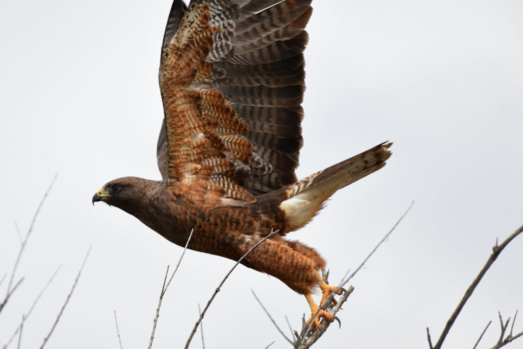 This flying Swainson’s hawk was on the road on the way to the Bear River Wildlife Refuge and I was able to stop in my truck, aim my camera and catch him as he took off into the sky.