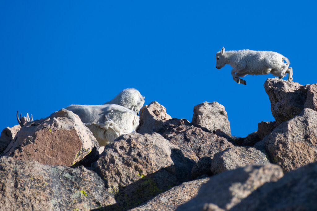 It was only the second time that I had tried to run with this herd of Mountain Goats, and I had the shot in mind of a Mountain Goat Jumping in the air with the blue sky background. After running and catching up several times, I got this shot and a sequence of shots as this little guy jumped from one rock to another. I even got the perfect shot with the kid goat in the air, but I must have been so excited when I was editing that I accidentally deleted it forever, but this one is still fun!