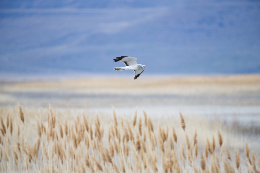 This hawk usually hunts just far enough away from the road to make it difficult for me to get a good photo. On that day, this Harrier was hunting closer to the road, but in order to get this shot, I had to catch up with it and as soon as I did it would turn around, so I would put my truck in reverse and try again. After about six times, I got this photo while driving 30 miles per hour carefully shooting out my window.