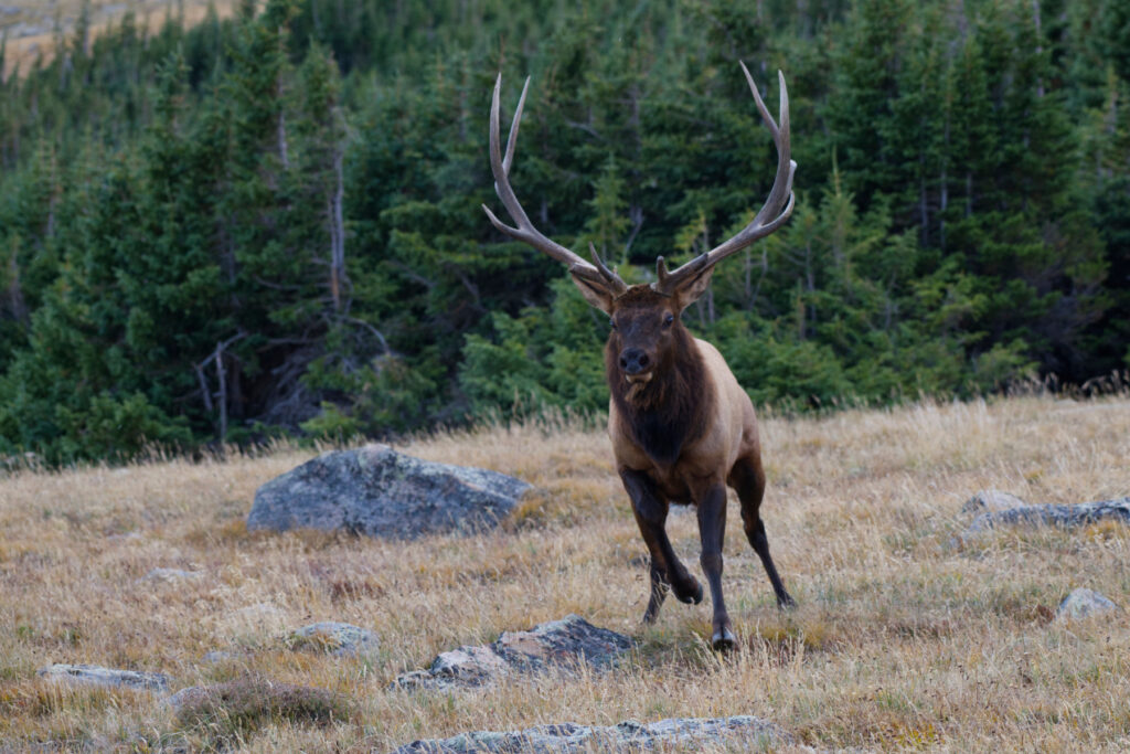 I had been wandering around with these bulls and about 30 cow elk for hours, enthralled by every one of them. This big bull was constantly busy schmoozing his ladies so they would not run away to another bull, bugling loudly letting other bulls know that he was there, and chasing off the satellite bulls that were actively trying to take his ladies. Even though it looks like he is coming after me in this shot, he is actually chasing off a much faster satellite bull, while the other, smaller bulls (and me) are glad that he is not chasing after us.