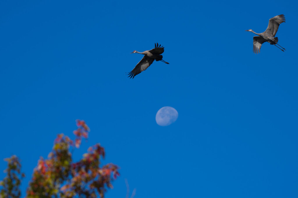 While wading and walking around in the Thousand Islands Fox River, I noticed that the moon was in the perfect place and that I could put a great egret with the moon. Then I noticed some beautiful fall colors in just the right place. Soon 2 sandhill cranes started circling, and as fate would have it, they flew in just the right place for this rare shot!