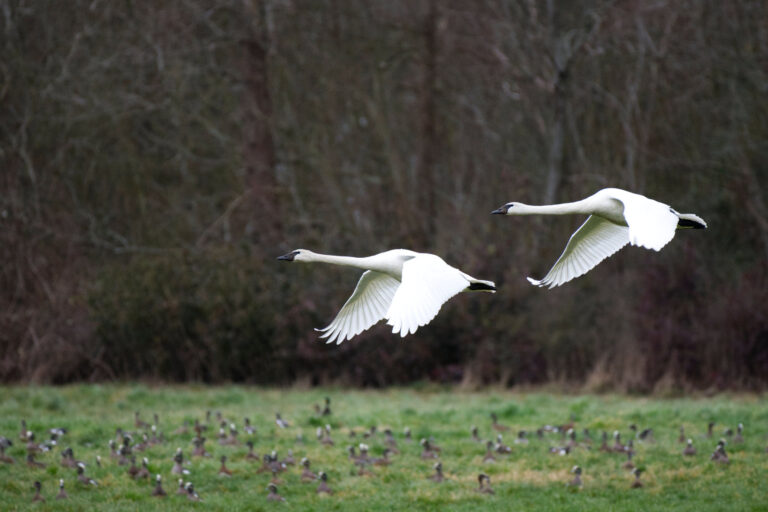 I walked slowly toward the geese and of course, some of the ducks started flying first, but I was able to get close enough to get this elegant shot of these two flying trumpeter swans with wigeons still in the field and forest in the background.