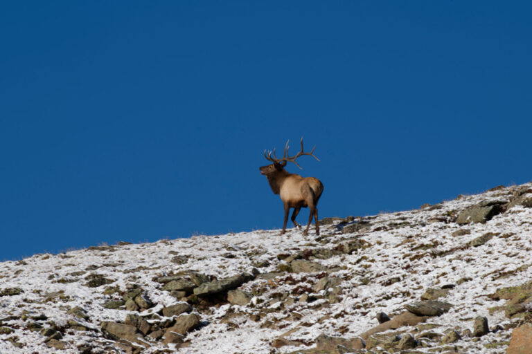 On this unbelievable day, there was a skiff of snow covering the alpine high in the Rocky Mountains, and I encountered well over 20 big bull elk wandering around, bugling, challenging each other and wondering about the human with the tripod and camera. This particular bull stood out because of his almost perfect white-tipped antlers and the way he put his head all the way back as he ran. Somehow, I caught up with him and captured this photo.