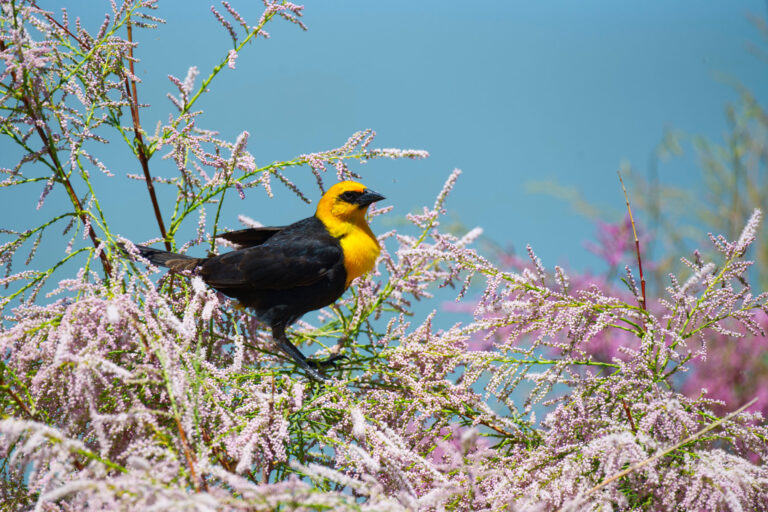 Yellow Headed Blackbird With Tamarisk Tree Blossoms